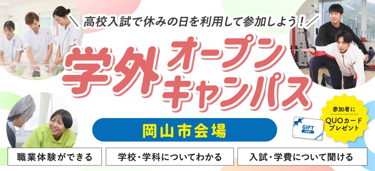 岡山県内の高校入試(推薦・一般)が行われる2月5日(木)と3月11日(水)、美作市スポーツ医療看護専門学校が岡山市内へ出張しオープンキャンパスを開催いたします!